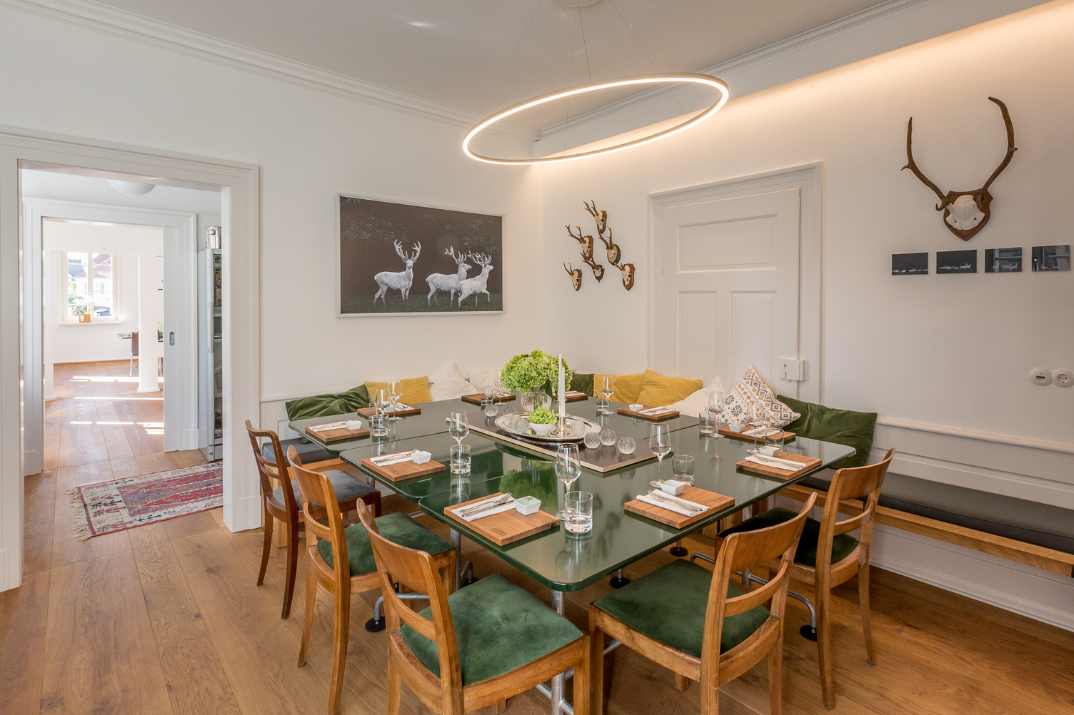 This elliptical LED ring luminaire emits direct light and fits perfectly as a pendant or surface-mounted luminaire above oval or rectangular tables and counters. If several are combined with each other, further promising shapes and illuminations are created.