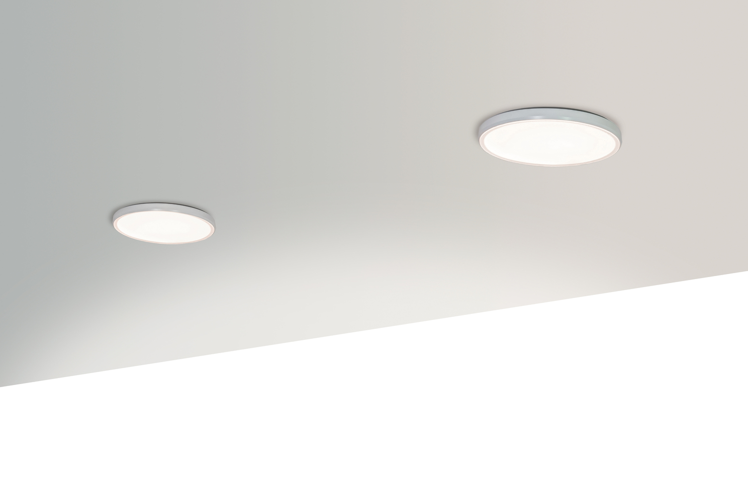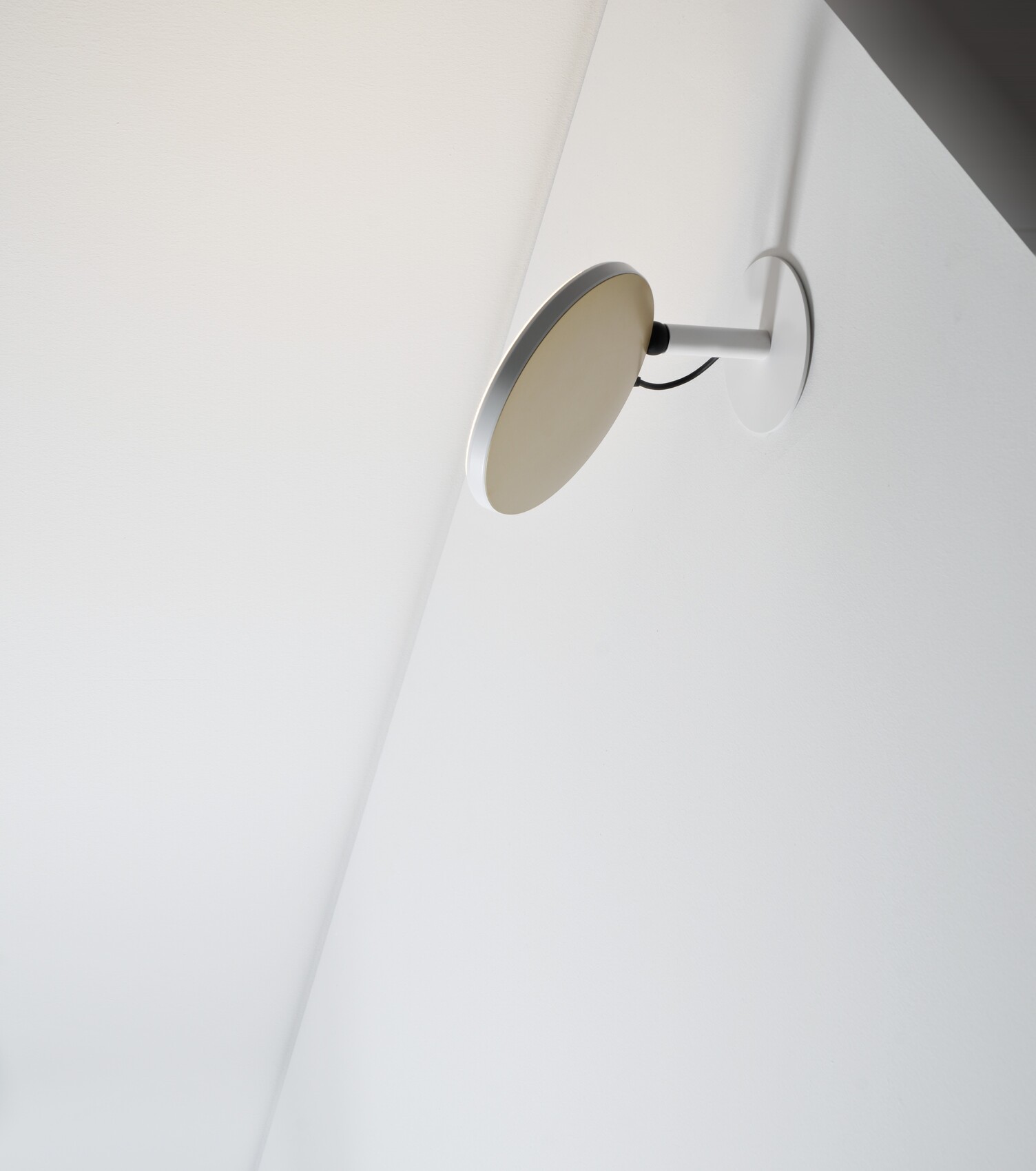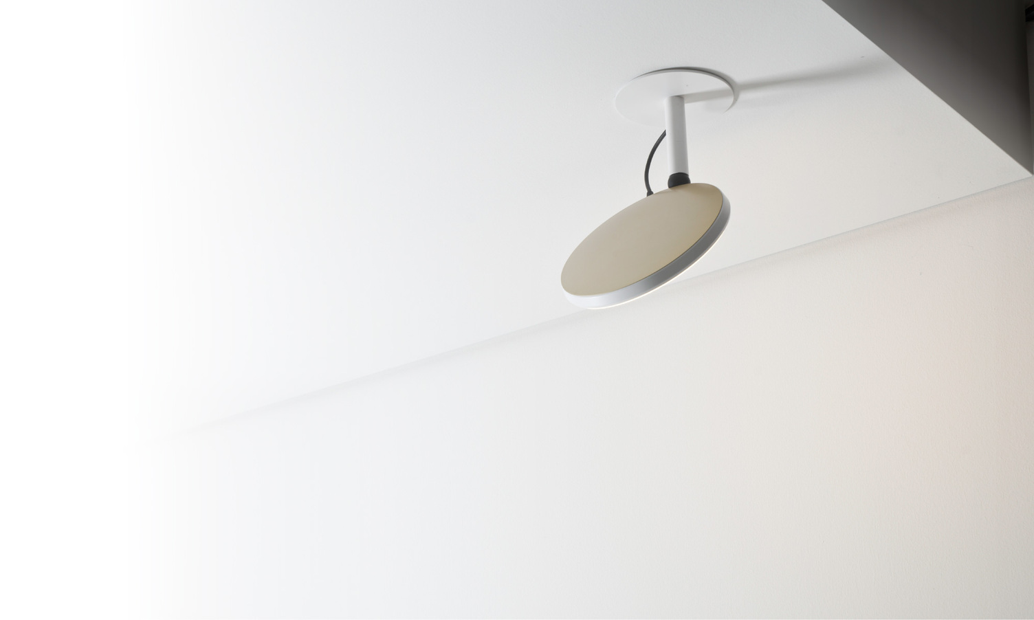 AVVENI DOWNLIGHT FRAMELESS. Recessed ceiling light. Luminaire head can be replaced as required and can be rotated and swivelled using a ball joint. Luminaire head with FLOOD or SPOT illumination (spot version: 26° or 34° beam angle). Built-in round luminaire bowl is flush with the ceiling and has a positive fit. A flat, round AVVENI luminaire head is movably fixed in this. When folded into the light pot, the entire luminaire is flush with the ceiling. The luminaire head can be folded out and rotated as a surface or spot light. Ideal for homogeneous ambient lighting or alternating focal lighting on cupboards or in corridors to illuminate paths or pictures.