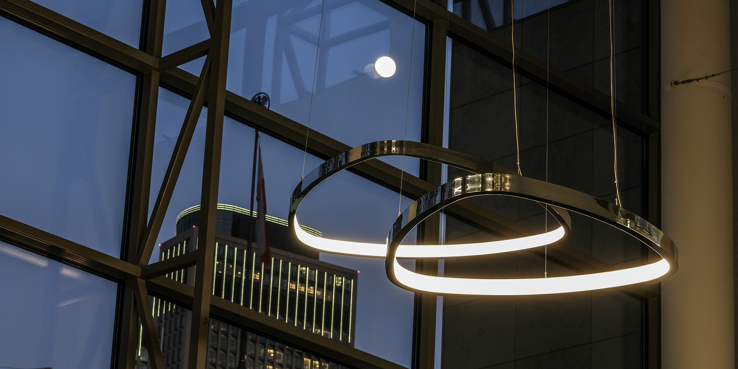 It is available in diameters from 750 mm up to 3.5 m and with a profile height of 80 mm or 140 mm (ideal for multiple LED fittings), and as a pendant or surface-mounted luminaire.