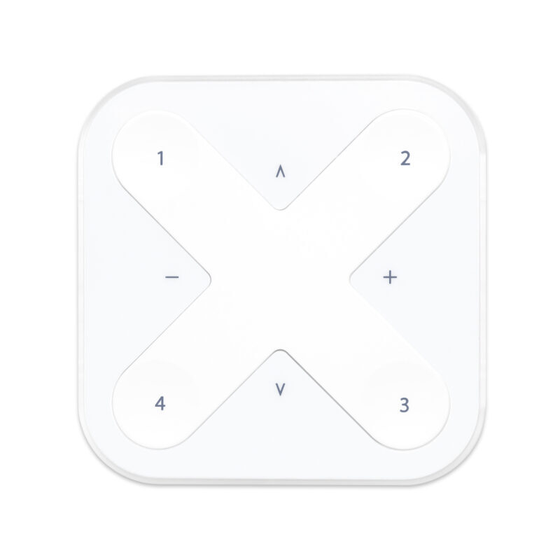 The four target buttons can control a scene or an animation of the user‘s choice or simply one luminaire, one luminaire group or all lights together if so desired. Up to 4 groups may be separately programmed. It comes with a wall mounting plate.