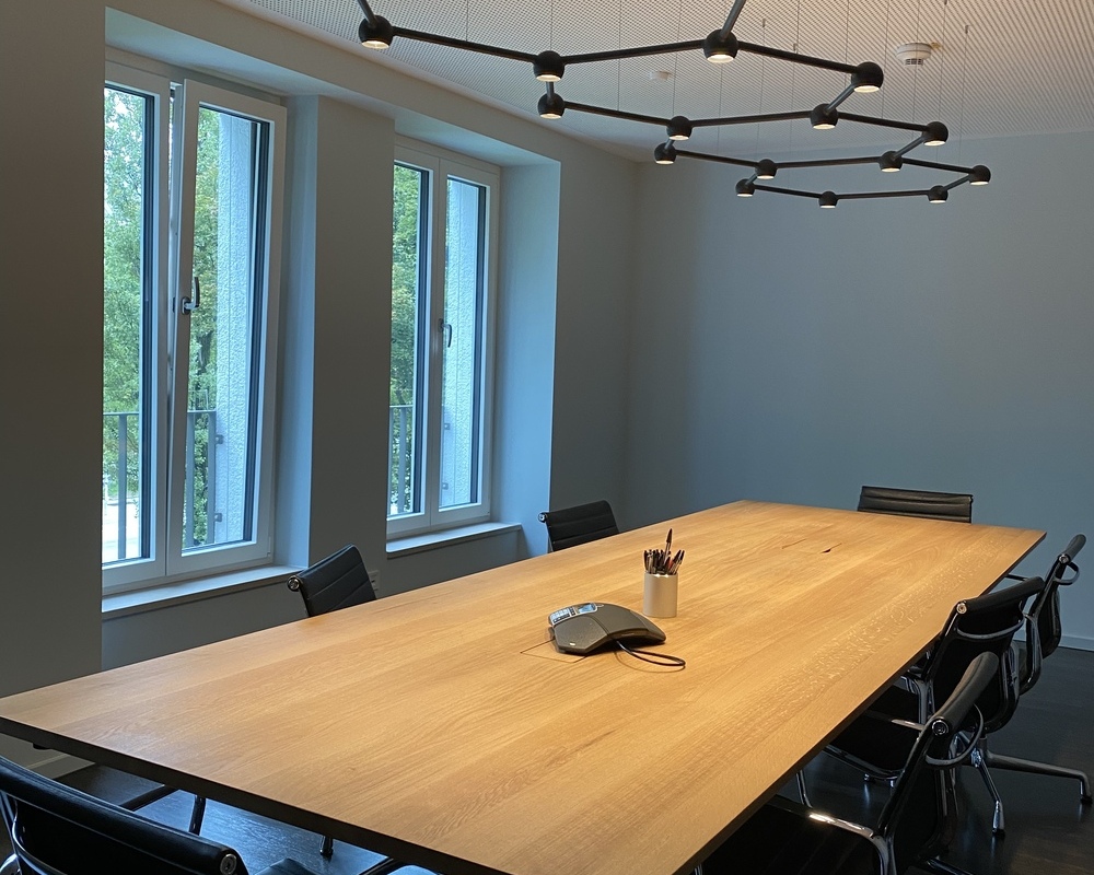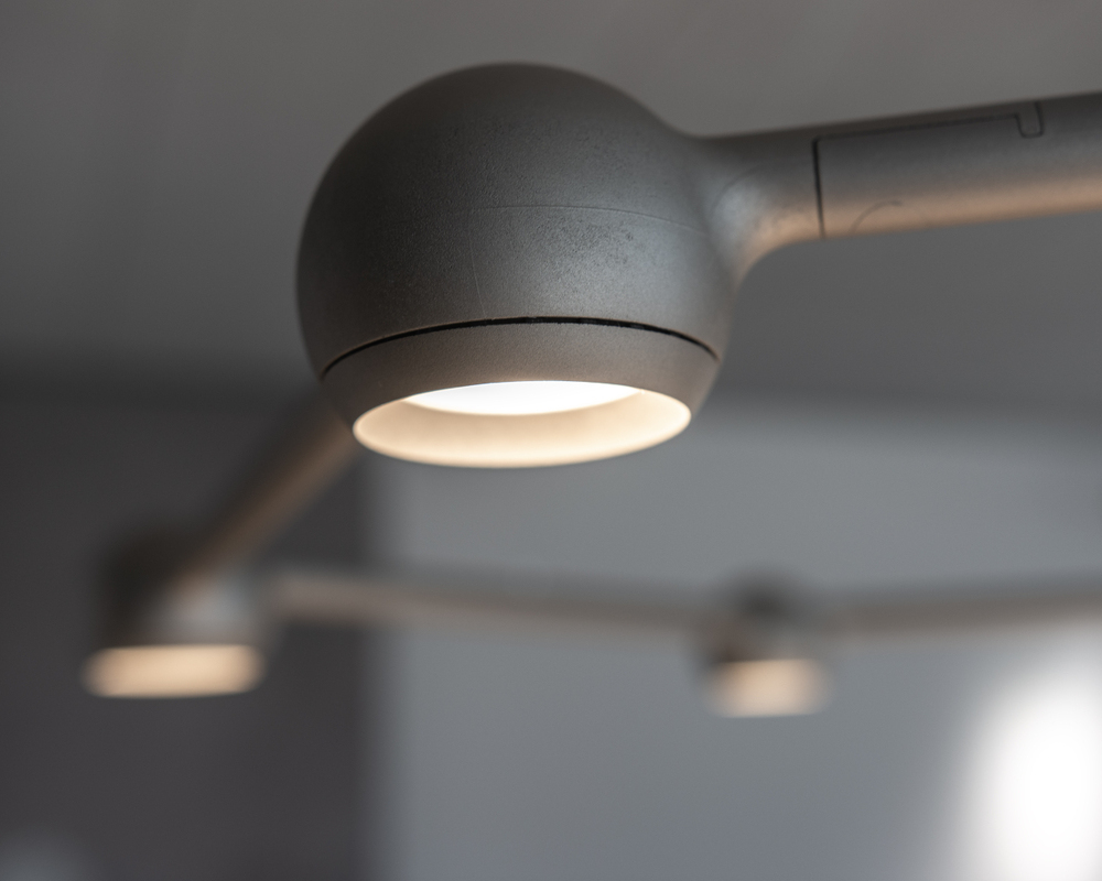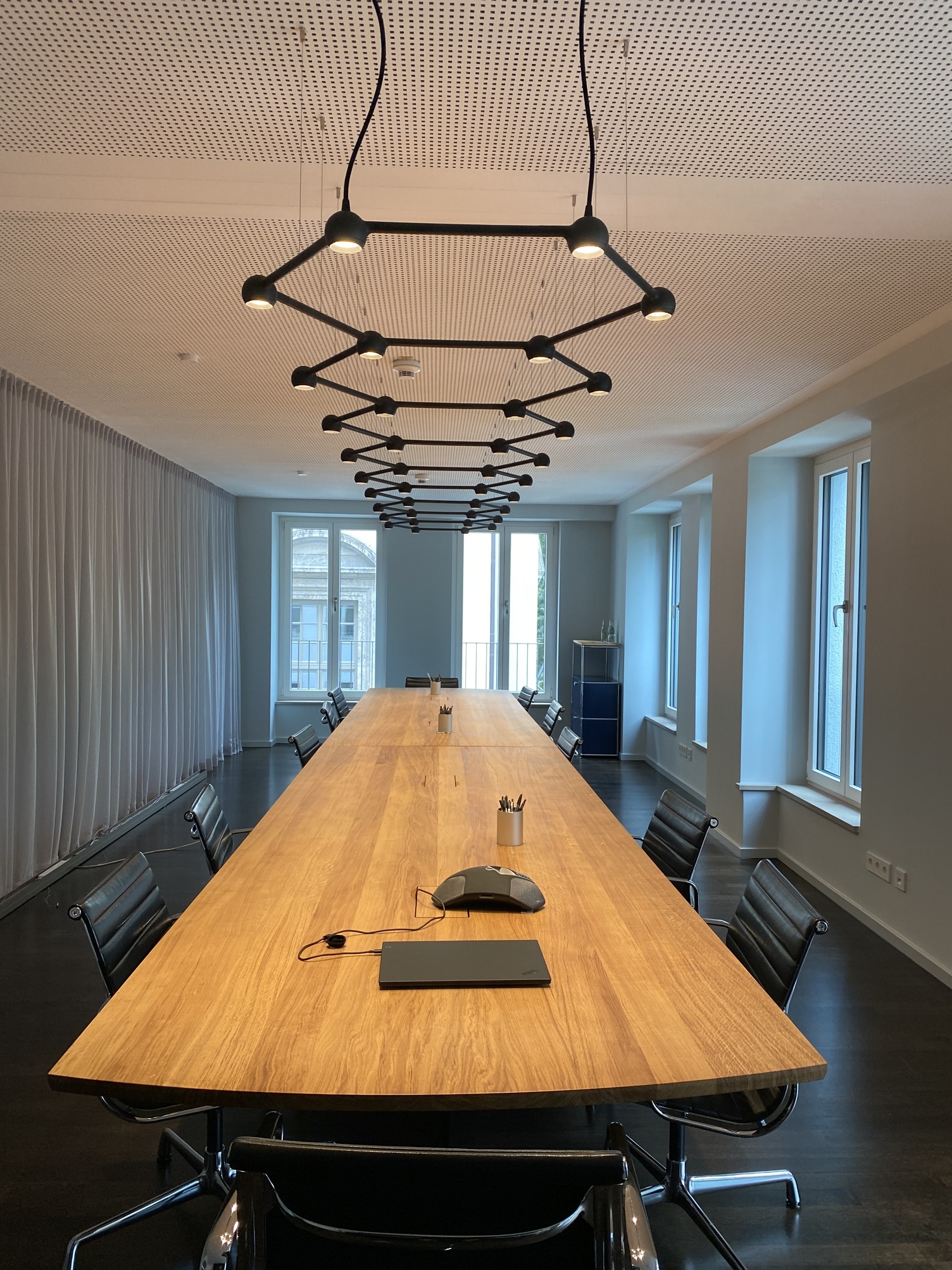 One honeycomb has 6 light heads. One spotlight per light head, equipped with a 24° lens. Modern, efficient LED technology with 3.5 watts and 420 lumens. The extremely heat-conductive thermoplastic base material ensures even cooling and a sophisticated look. Direct and indirect lighting, switchable and dimmable via DALI.