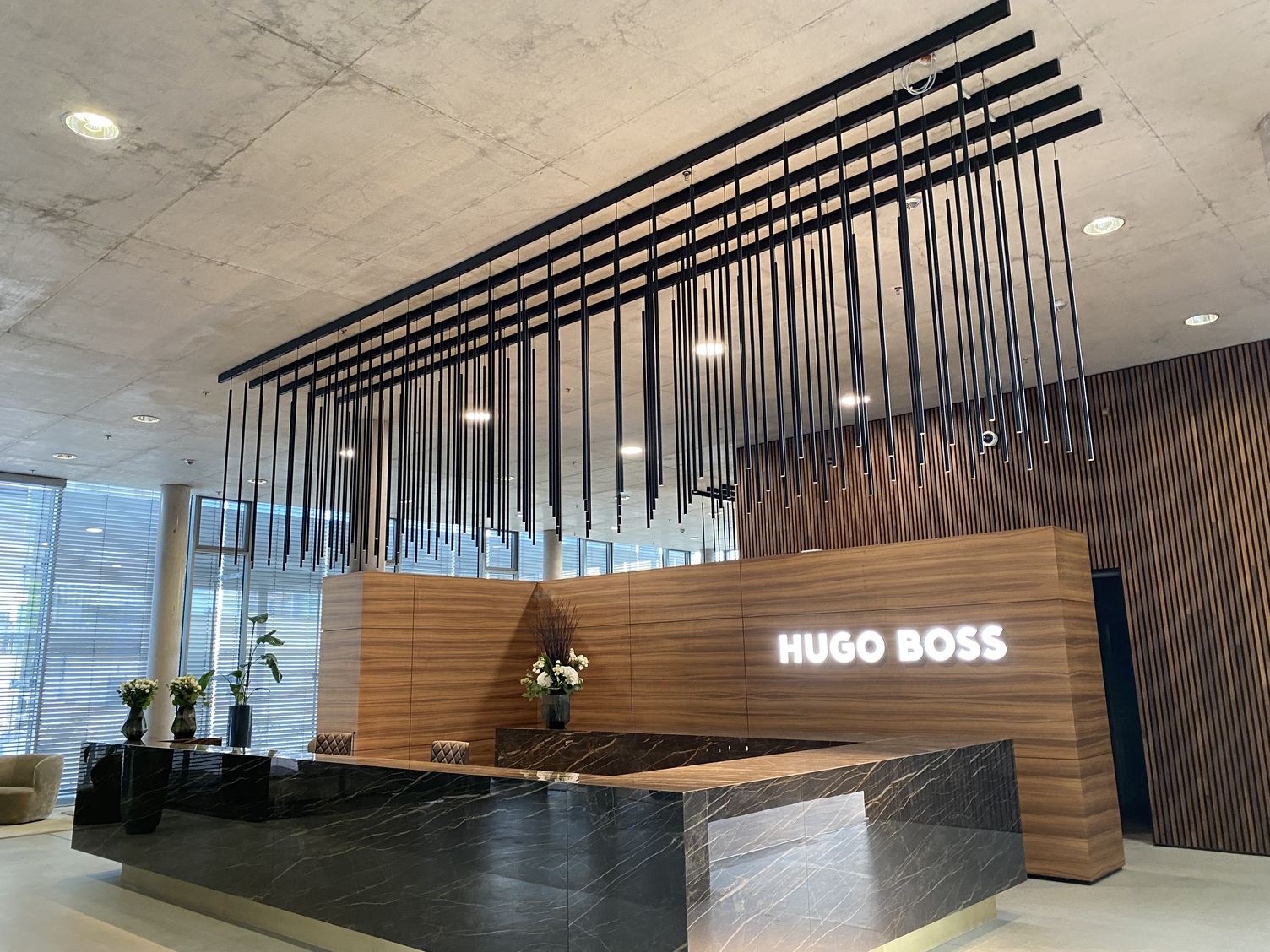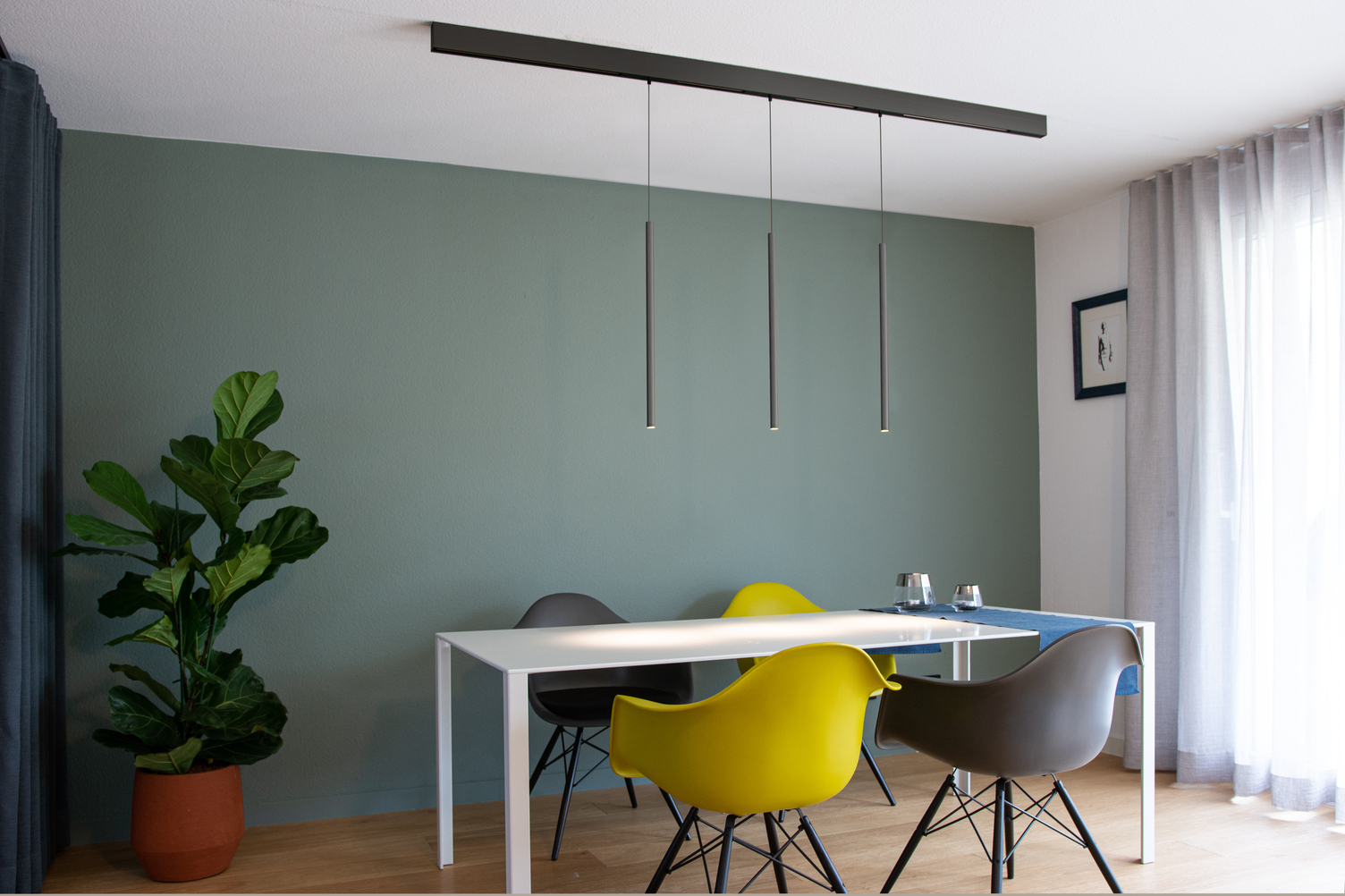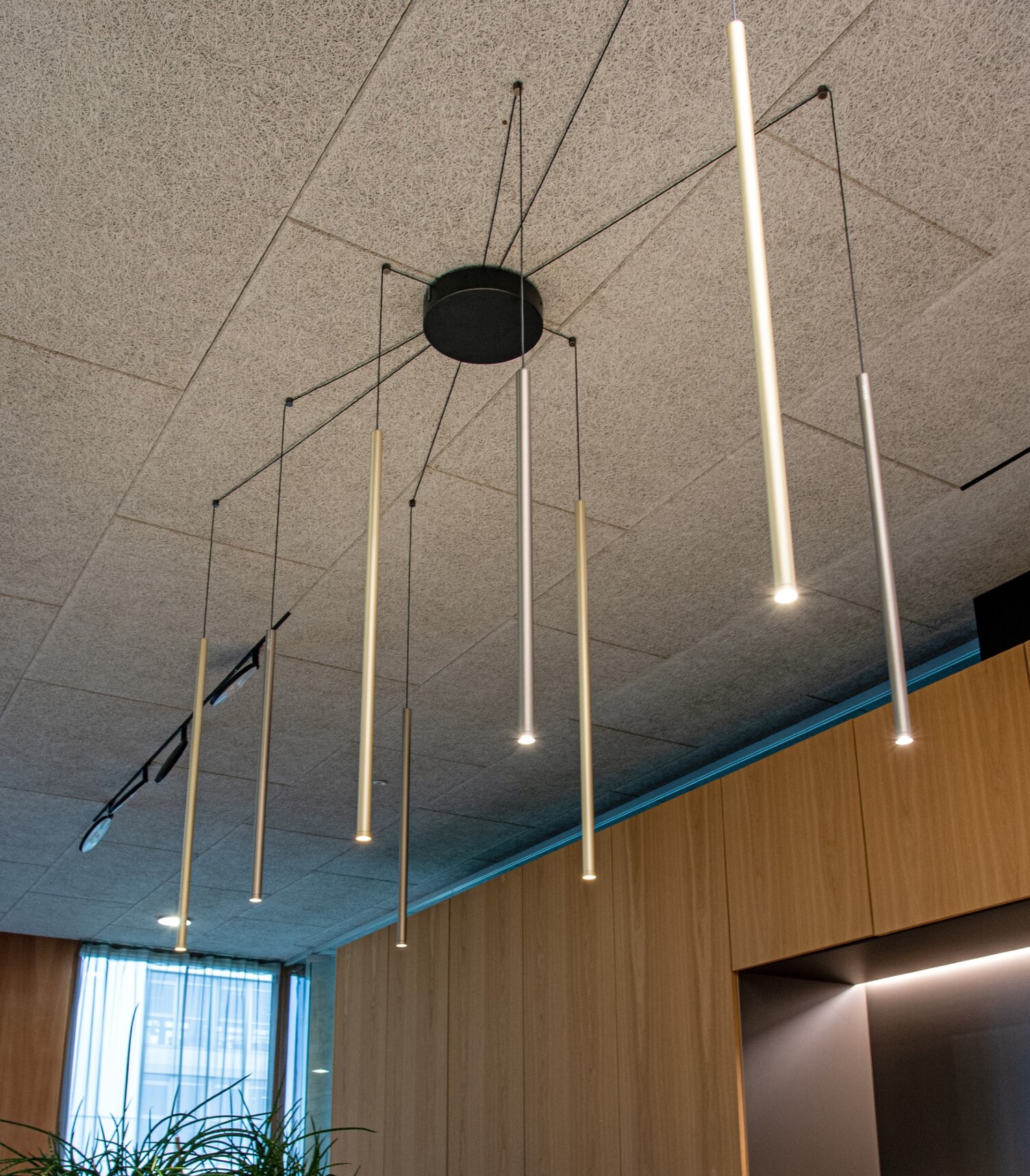 A special “eye-catcher” when several FIOs are combined. Like here as a set of 10. Depending on the distance, the decorative light image conjures up rings on the incident surface. Combination of 10 pendant lights with ceiling panel, consisting of 5 x FIO 500 mm and 5 x FIO 750 mm.