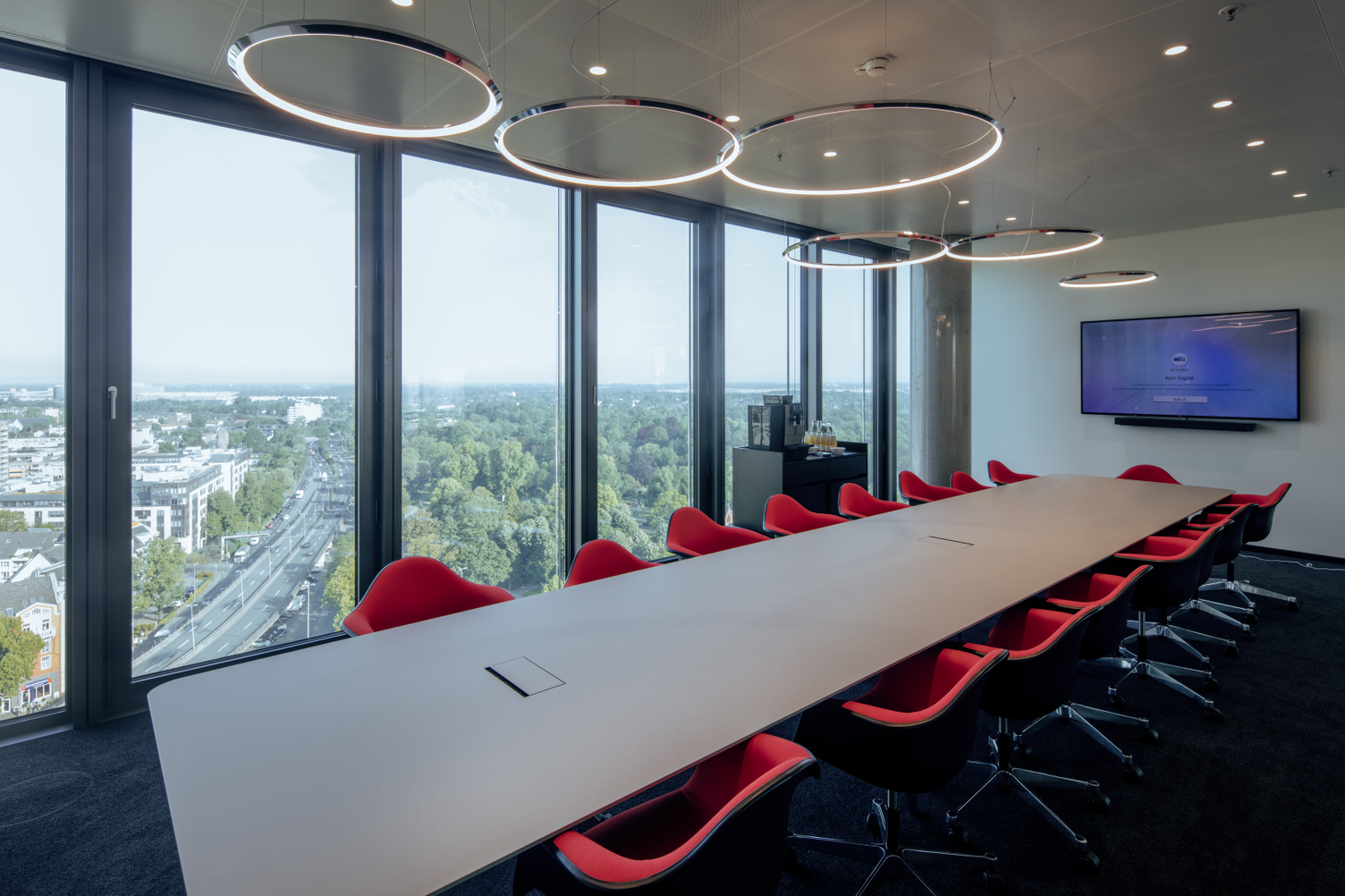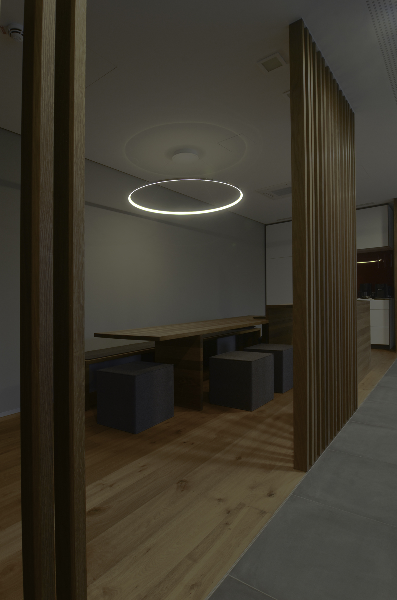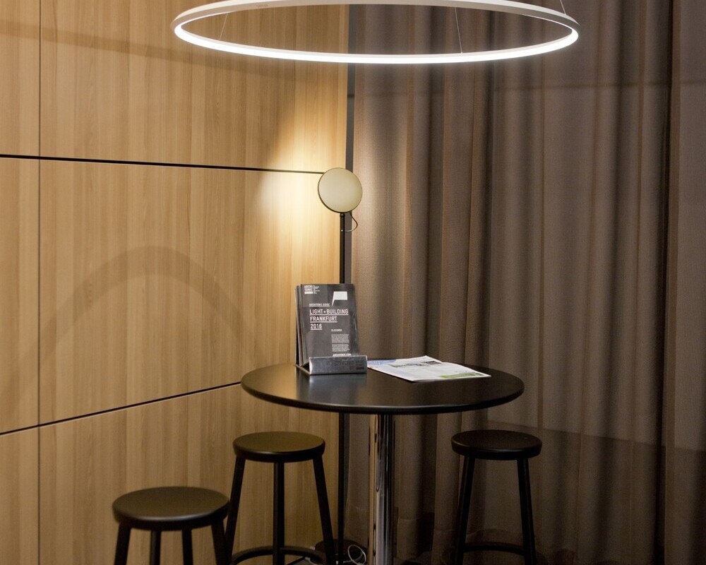 Ring-shaped aluminium profile, bent inwards by 45°, with inserted opal diffuser, CRI>90. It is available in 4 sizes from Ø 600 mm - Ø 1.55 m. Suitable for meeting tables, lounge areas, dining rooms, living rooms, shops and beyond.