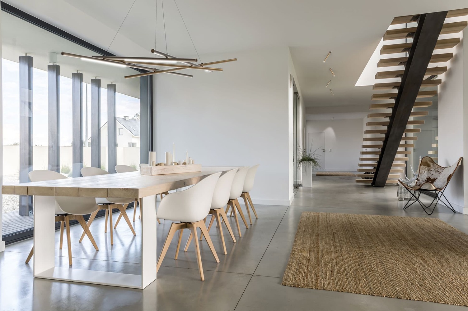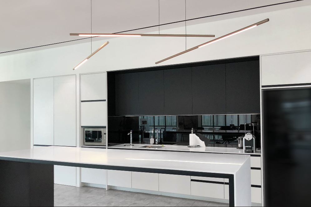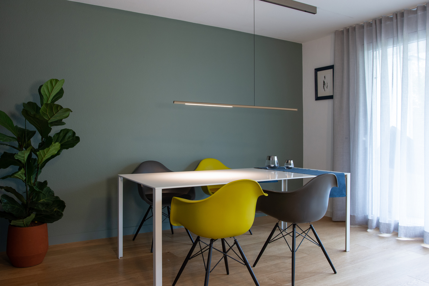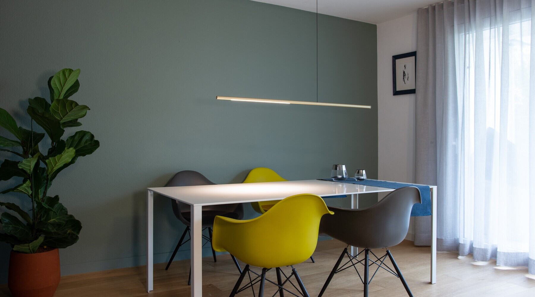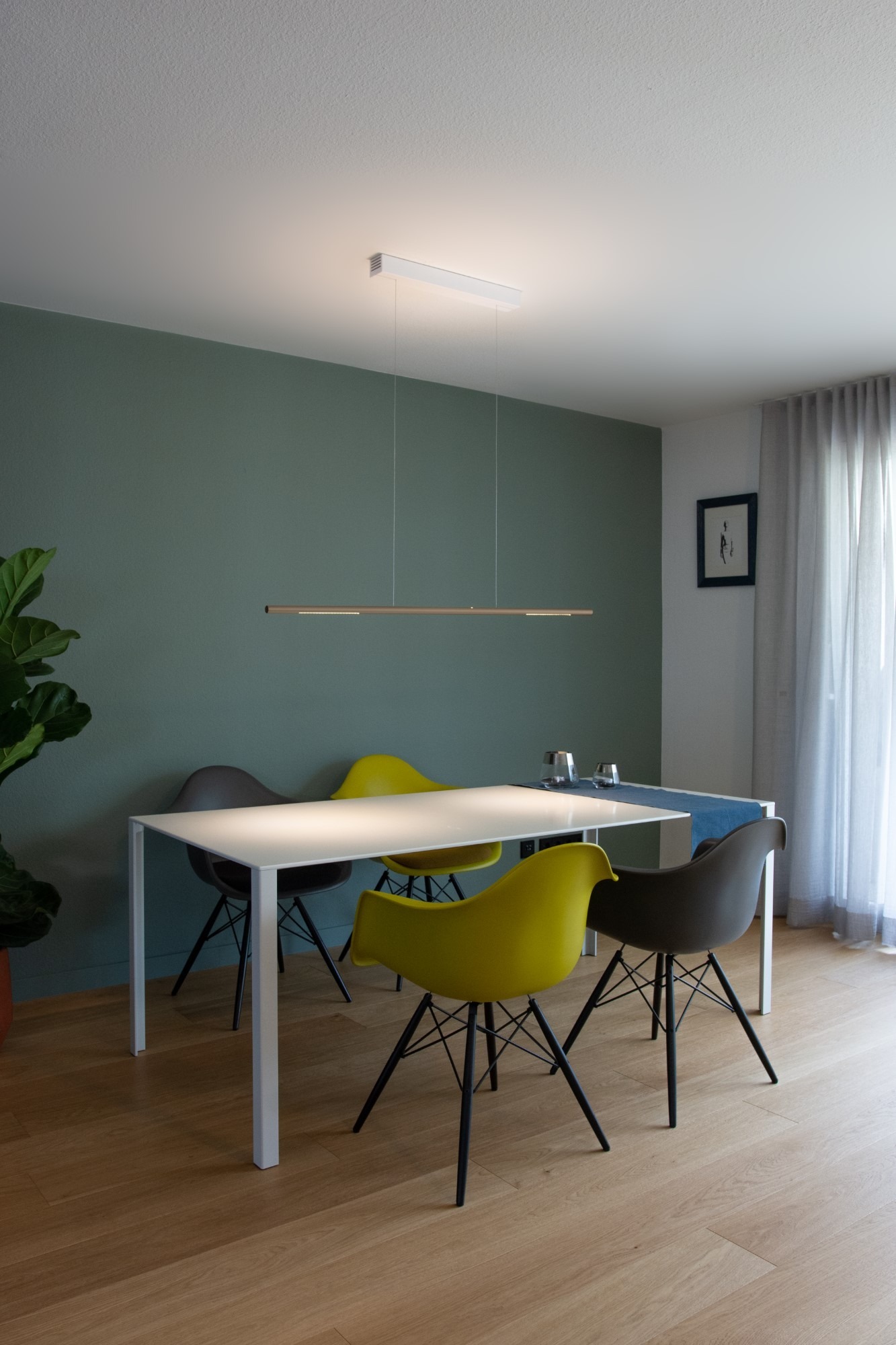 The cylindrical PALITO pendant luminaire seems to defy the laws of gravity. The asymmetrically suspended luminaire floats horizontally in the room, harmoniously balanced. An integrated, finely adjustable counterweight brings it into the desired position. The alignment can be changed at any time using the knurled nut.