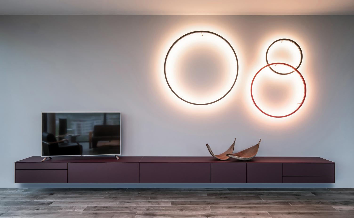 Whether as a pendant or surface-mounted luminaire, individually or in combination, a beautifully luminous hand-polished aluminium ring, powder-coated in colour or in clear white.