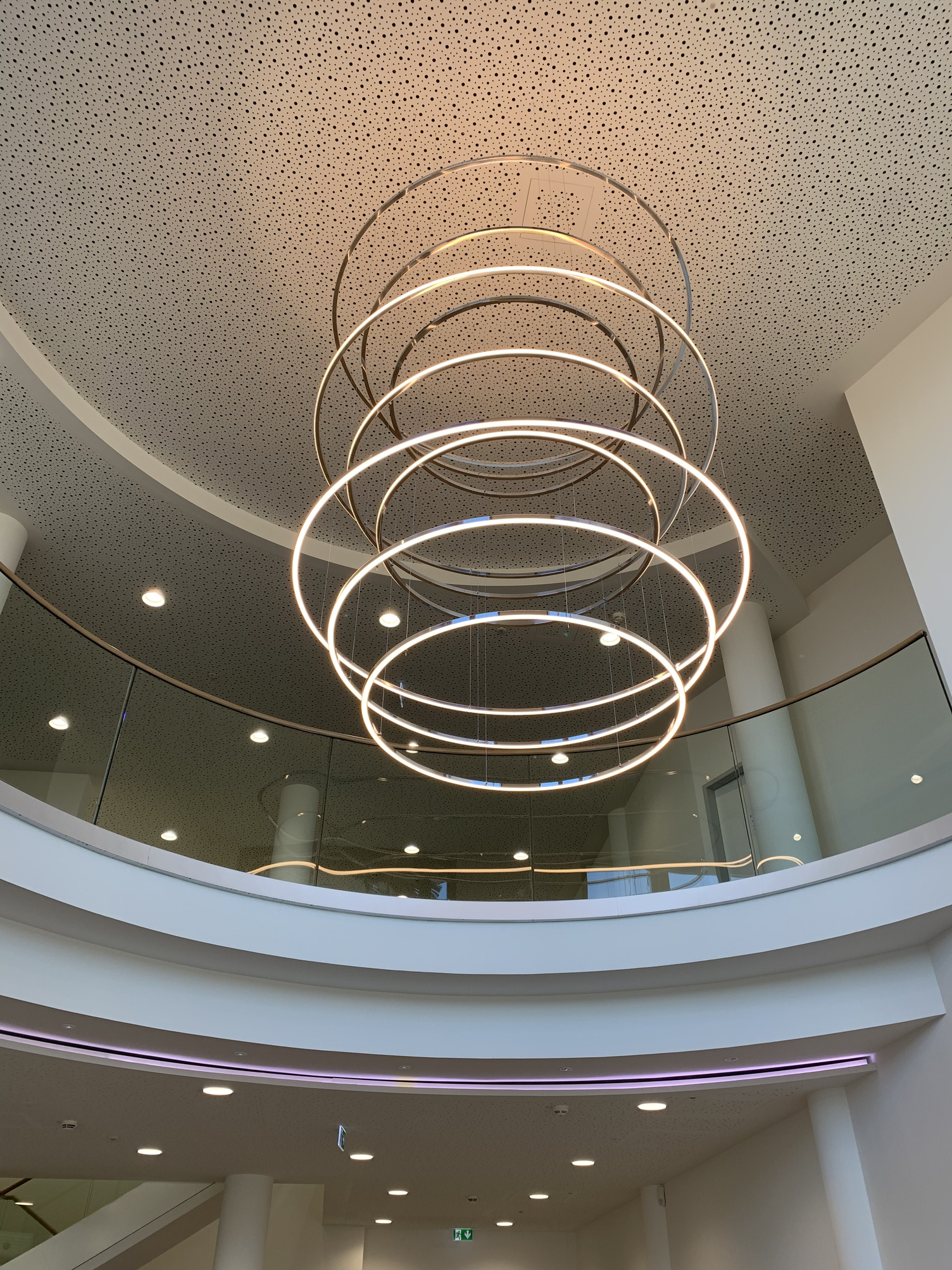 SATTLER's INSIEME series combines modern elegance with a sophisticated, functional design and provides an extraordinary lighting effect. This pendant luminaire consists of three ring-shaped aluminium elements that diffuse light in different directions: upwards, sideways and downwards. This combination makes INSIEME a perfect centrepiece for large spaces such as foyers, reception areas or lounges, where the luminaire provides atmospheric room illumination.