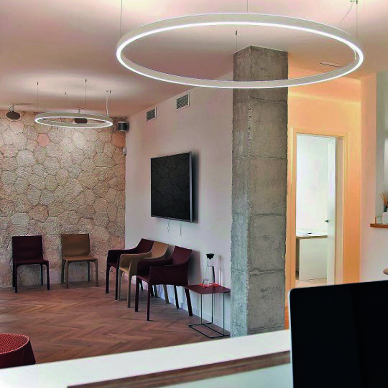 LED pendant light, made of a 2 cm flat profile, in four sizes up to Ø 1,900 mm. Different illuminations and elegant surface variants enable a wide range of applications.