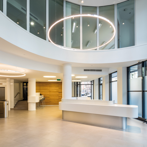 As striking lighting directly above the reception area at the entrance, in foyers, in conference rooms or lounges