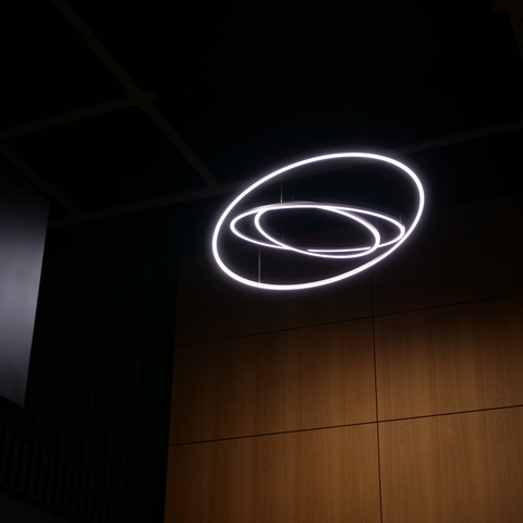 The TOCCATA pendant light, consisting of 3 to 5 connected ring lights, which offers its own special beauty from every perspective.