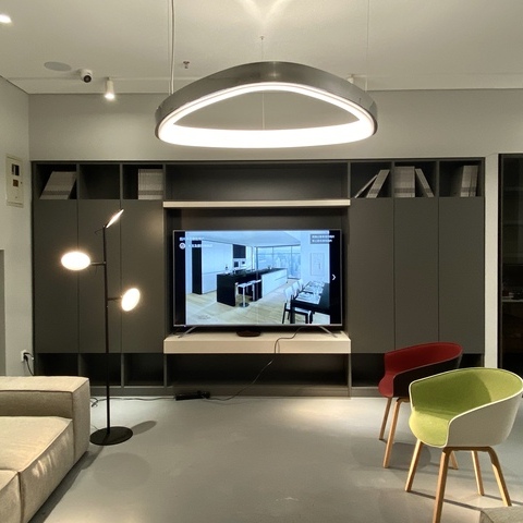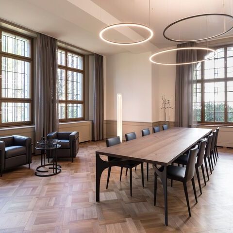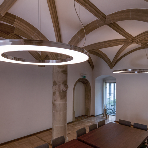In addition to the standard product portfolio, there are many individual lighting solutions realised with ring lights. Furniture that is present in another room often lends itself to adapting a luminaire to this shape, picking up on it and reflecting it. In meeting rooms, for example, there are often very strongly shaped and present meeting table shapes that need to be illuminated at the same time.