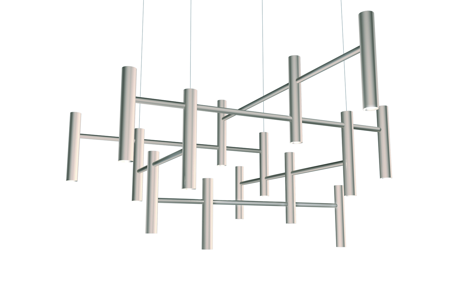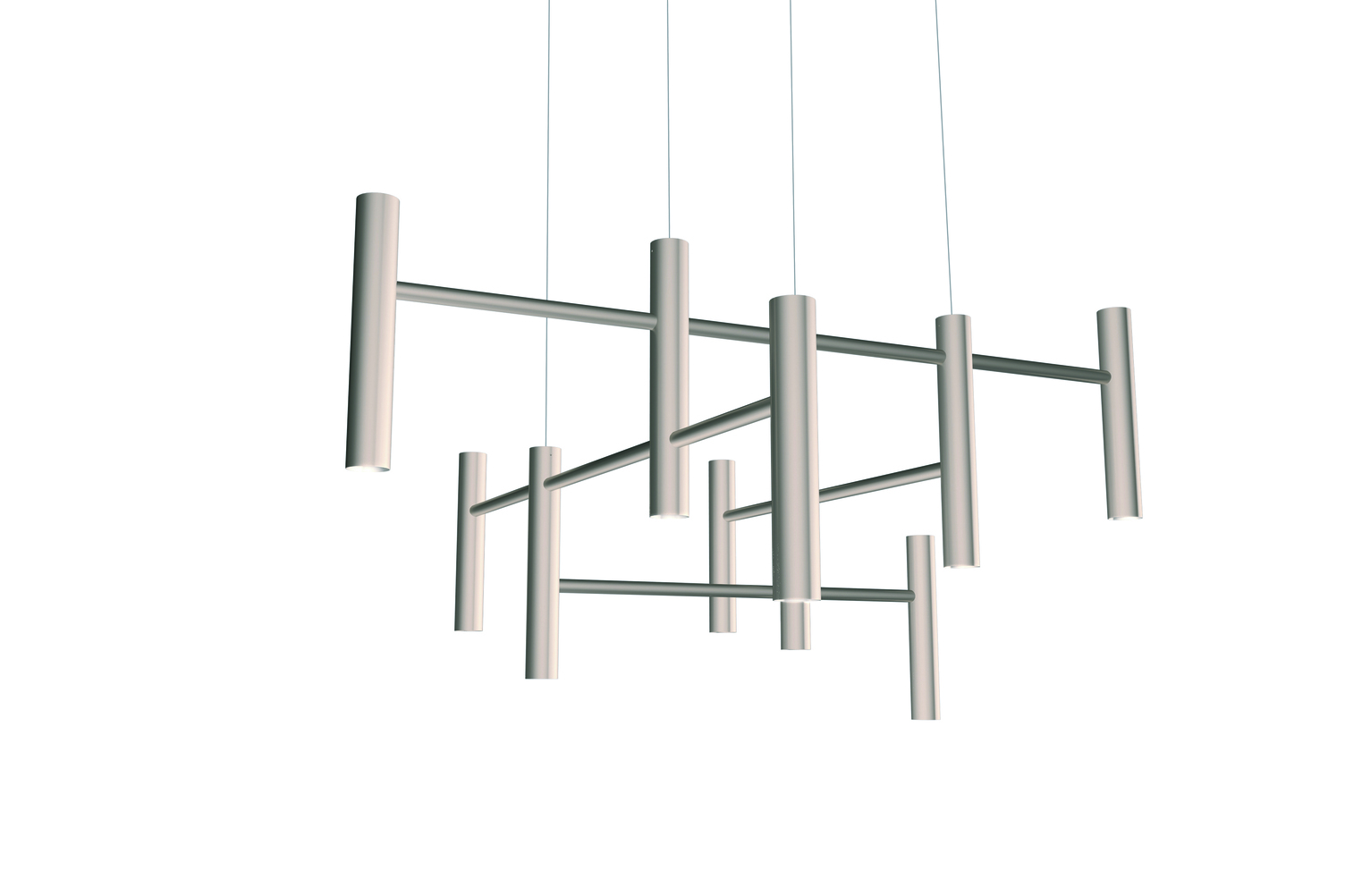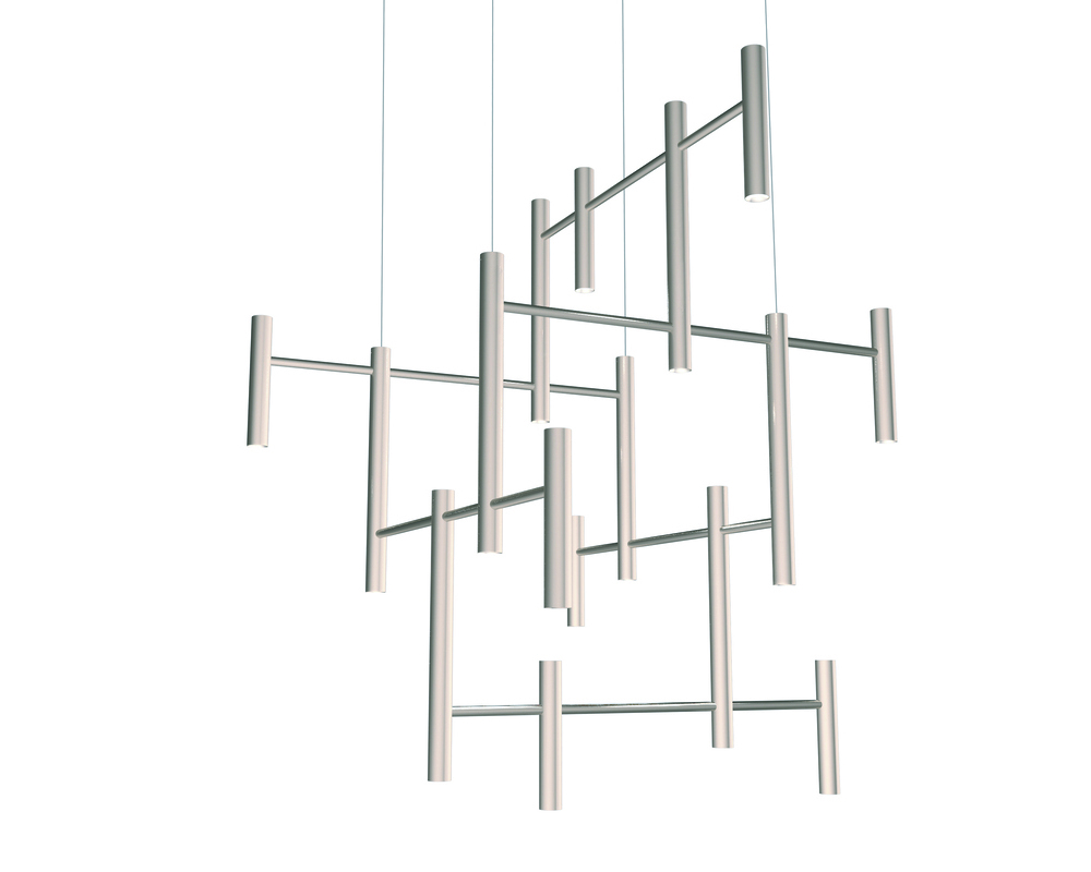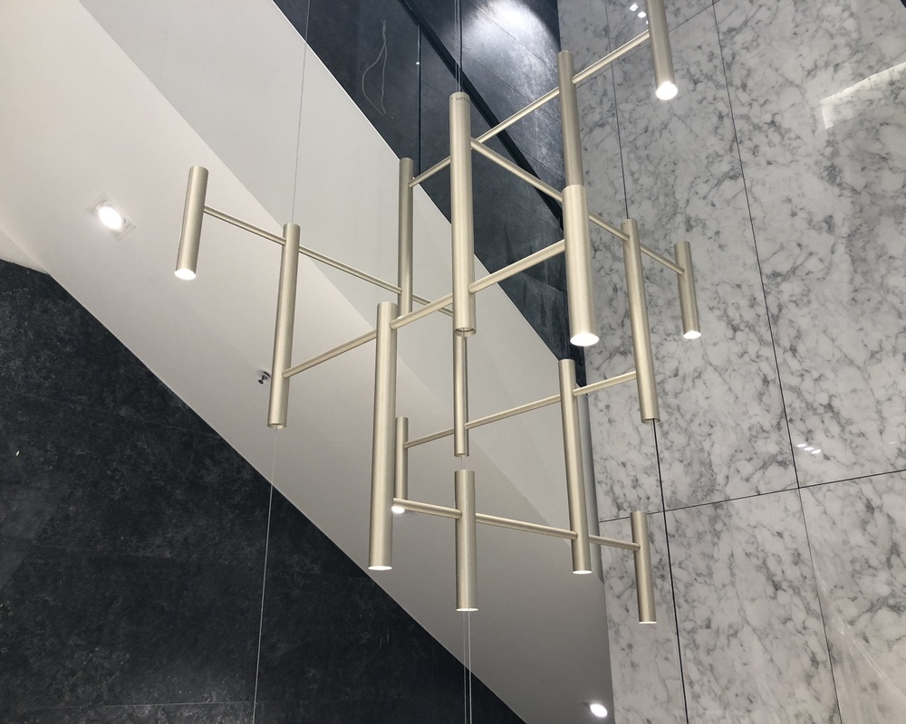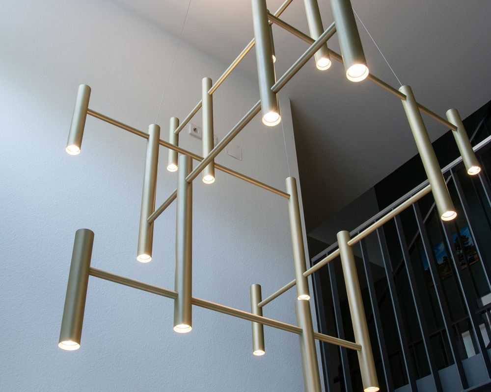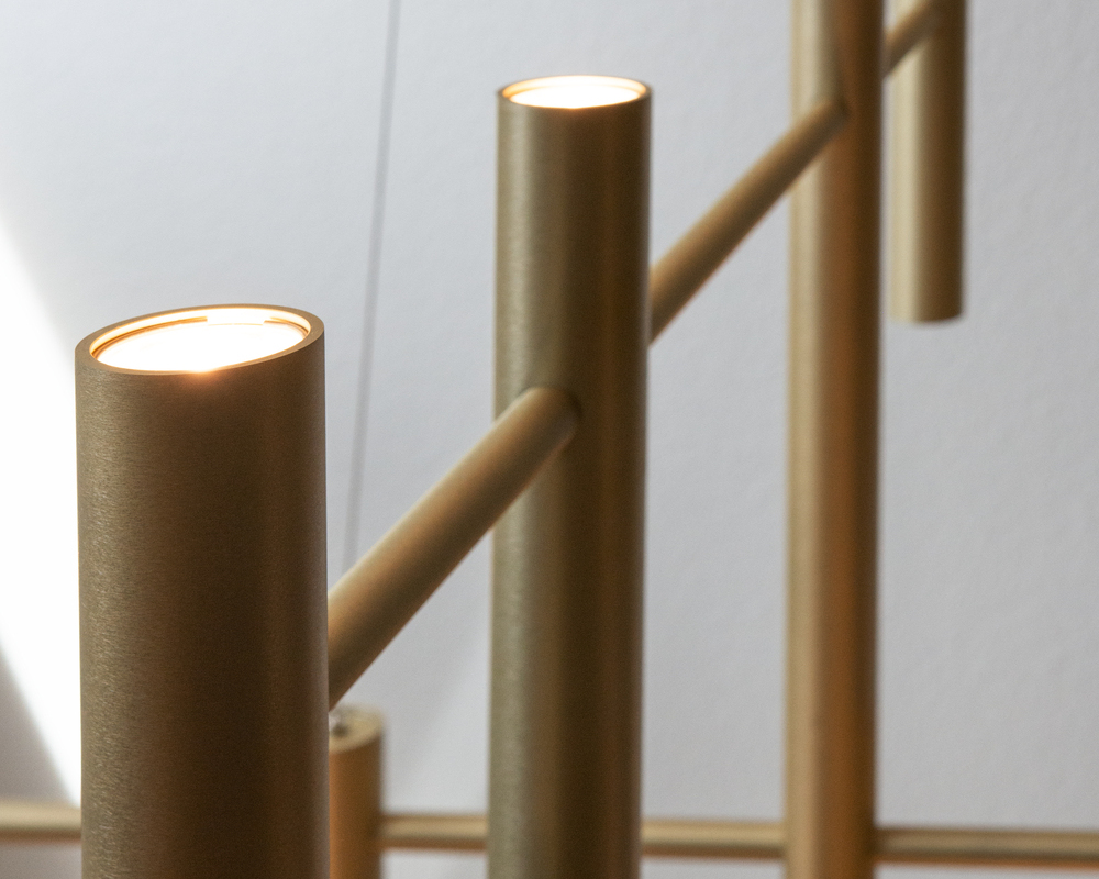 EVOLUTION VERTICAL 1: Die EVOLUTION VERTICAL bildet sich durch unterschiedliche Rohrlängen und mehreren Querverbindungen auf mehreren Ebenen zu einem Gesamtkunstwerk aus. Die VERTICAL 1 besteht aus einem Element, eine Ebene, direkt leuchtend, CRI>90 mit 10 verschiedenen Spot-Lichtern auf verschiedenen Höhen. Ein weiterer moderner Kronleuchter ist das Ergebnis.