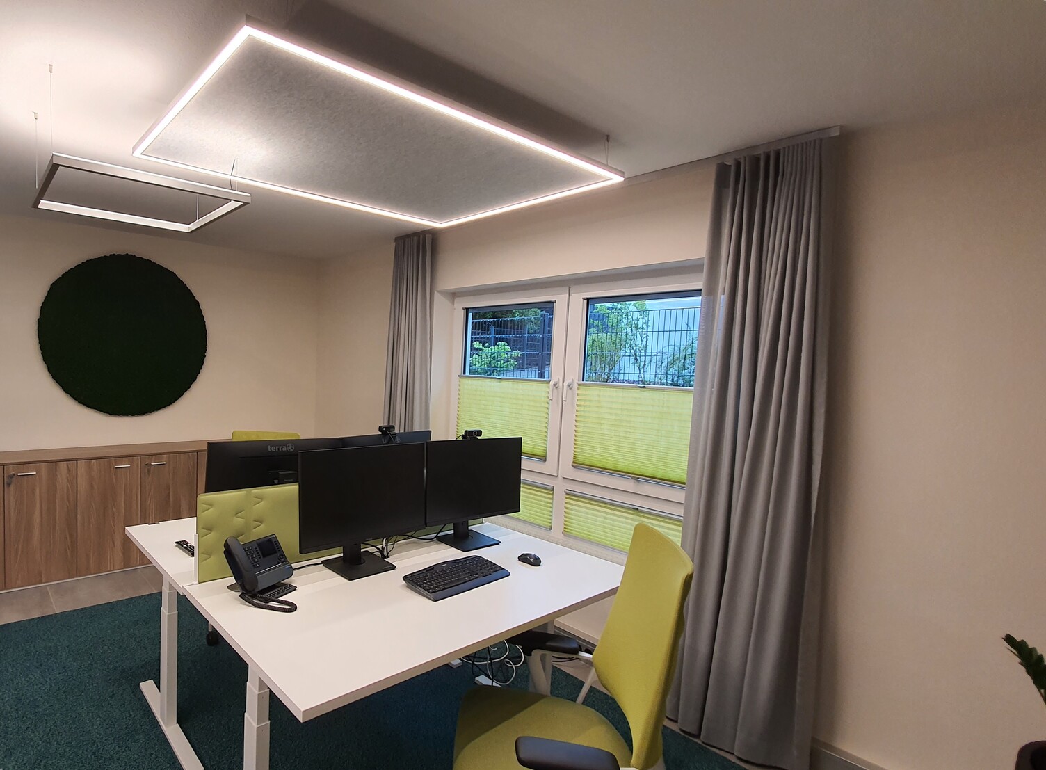Das optionale ACOUSTIC SET mit einem hochwirksamen Schallabsorber aus Filz lässt sich dabei jederzeit an vorhandene GIOCO direkt Leuchten anbauen und sorgt für eine spürbare Reduktion des Widerhalls und eine entsprechende Verbesserung der gesamten Raumakustik wie in Besprechungsräume oder Lounges.