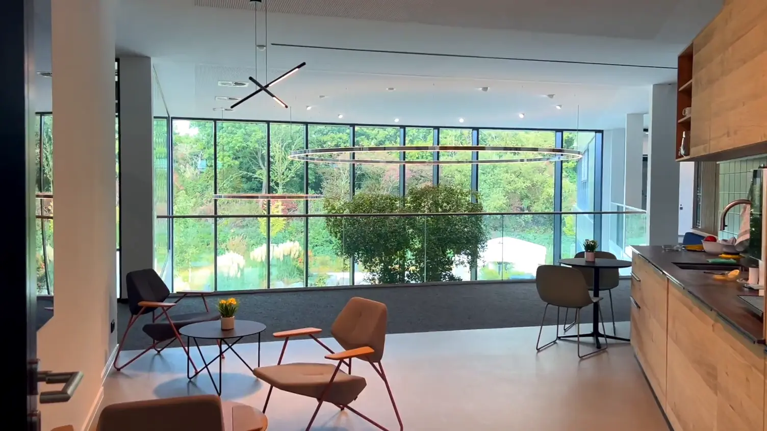 In den Besprechungsräumen sorgen mehrere Ringleuchten in abgestuften Durchmessern für eine gleichmäßige, blendfreie Grundhelligkeit. Die homogene Lichtverteilung unterstützt Gesichter und Gestik – entscheidend für Meetings, Workshops und hybride Videokonferenzen.