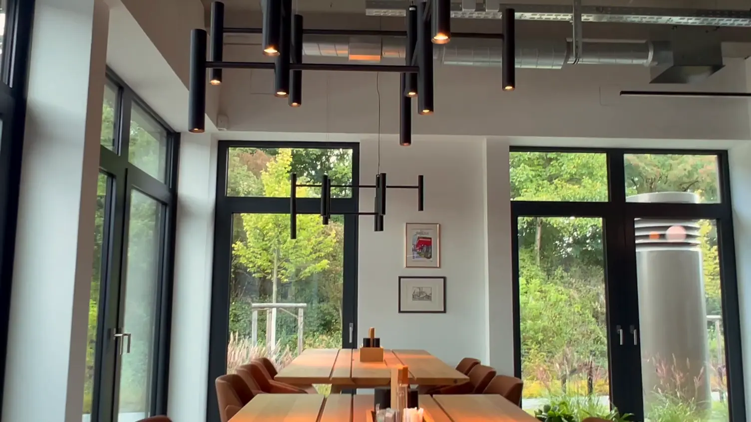 Die EVOLUTION S Pendelleuchte setzt in der Cafeteria einen skulpturalen Akzent.