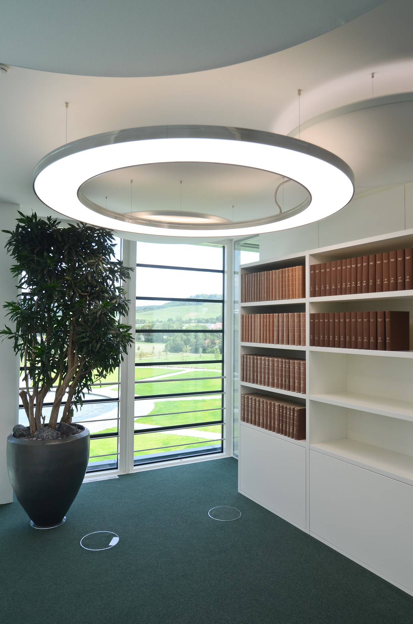 Um den Schallpegel des mit Steinboden ausgestatteten Entrées zu reduzieren und die Raumakustik zu optimieren, wurden in Anlehnung an die Leuchtenformen im EG und OG zusätzlich zu den Ringleuchten über 60 runde SATTLER Akustiksegel integriert. Die in unterschiedlichen Höhen, an dünnen Stahlseilen schwebenden Akustiksegel sind mit einer schallabsorbierenden Akustikmembran ausgestattet, zusätzlich teilweise hinterleuchtet und sorgen neben einer verbesserten Akustik mit zusätzlichem indirektem Lichtanteil für eine homogene Ausleuchtung des Raumes.