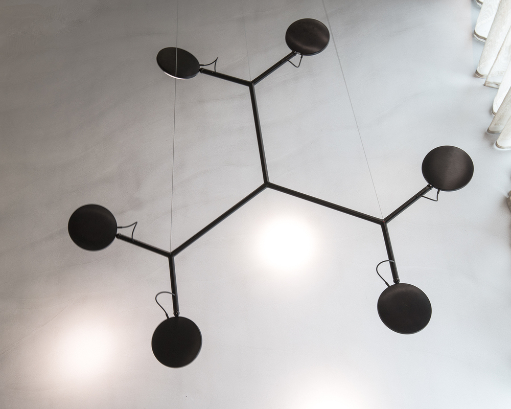 Diese Struktur verzweigt sich in dieser Variante kreisförmig, wobei von 3 gleich langen Hauptarmen jeweils 2 kleinere gleicher Länge abgehen und in die flexibel beweglichen Leuchtenköpfe enden. Durch ein magnetisches Scharniersystem und einer Steckerverbindung kann jeder Lichtkopf einzeln bewegt und auch abgenommen werden. Die Lichtköpfe sind als Flood- oder Spot-Version erhältlich (Diffusor: zirkulare Prismenscheibe, Linsen mit 26 und 34 Grad, CRI>92).