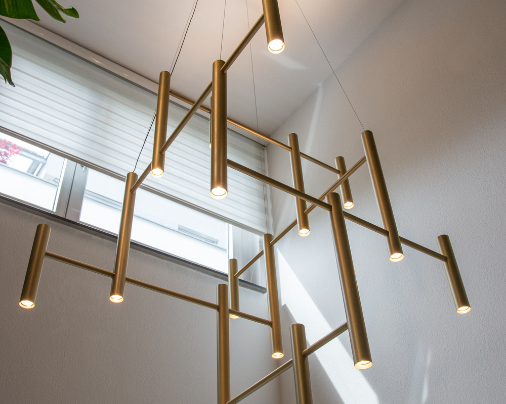 EVOLUTION VERTICAL 1: Die EVOLUTION VERTICAL bildet sich durch unterschiedliche Rohrlängen und mehreren Querverbindungen auf mehreren Ebenen zu einem Gesamtkunstwerk aus. Die VERTICAL 1 besteht aus einem Element, eine Ebene, direkt leuchtend, CRI>90 mit 10 verschiedenen Spot-Lichtern auf verschiedenen Höhen. Ein weiterer moderner Kronleuchter ist das Ergebnis.