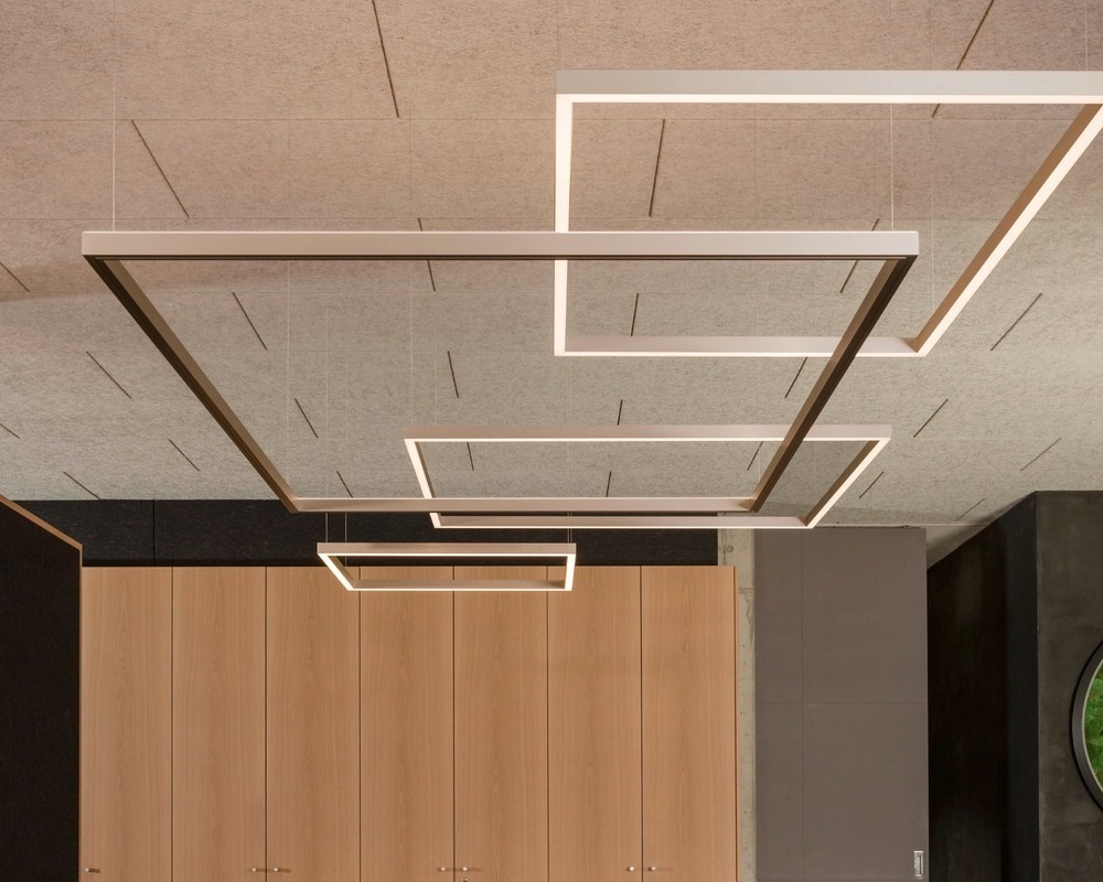 Das optionale ACOUSTIC SET mit einem hochwirksamen Schallabsorber aus Filz lässt sich dabei jederzeit an vorhandene GIOCO direkt Leuchten anbauen und sorgt für eine spürbare Reduktion des Widerhalls und eine entsprechende Verbesserung der gesamten Raumakustik wie in Besprechungsräume oder Lounges.