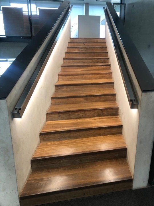 Integration von LED-Technik in bestehende Handläufe zur funktionalen und normgerechten Beleuchtung ohne Eingriff in die Architektur.